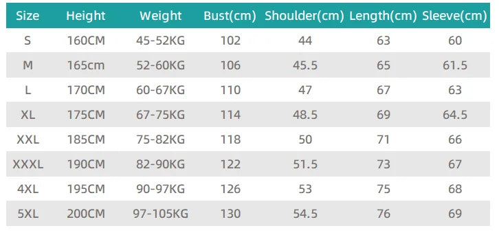size_info: {"sizeInfoList":[{"length":{"cm":"102","inch":"40.16"},"size":"S","vid":-45},{"length":{"cm":"106","inch":"41.73"},"size":"M","vid":-46},{"length":{"cm":"110","inch":"43.31"},"size":"L","vid":-47},{"length":{"cm":"114","inch":"44.88"},"size":"XL","vid":-48},{"length":{"cm":"118","inch":"46.46"},"size":"XXL","vid":-49},{"length":{"cm":"122","inch":"48.03"},"size":"XXXL","vid":-50},{"length":{"cm":"126","inch":"49.61"},"size":"4XL","vid":-51},{"length":{"cm":"130","inch":"51.18"},"size":"5XL","vid":-52}]}